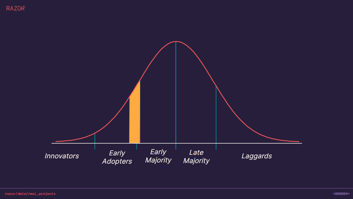We’re quickly moving from on from early adopters of this tech to majority adopters. So, whereas early adopters are comfortable with a degree of uncertainty, majority adopters need proof of success. They need to know that adopting data and AI strategies will have a clear and demonstrable impact.