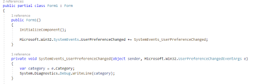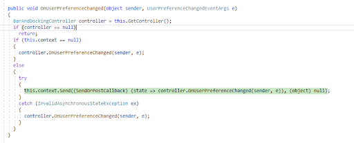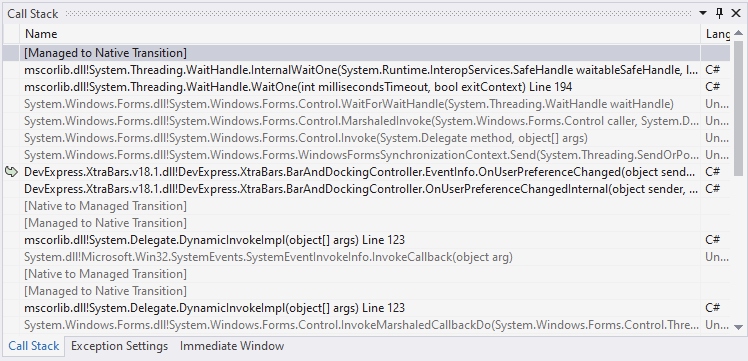 This shows that we need to look a bit closer at the code in question. We could see the event handler for user preference changed system event is an event being fired from the operating system. The DevExpress user interface control was responding to the event.